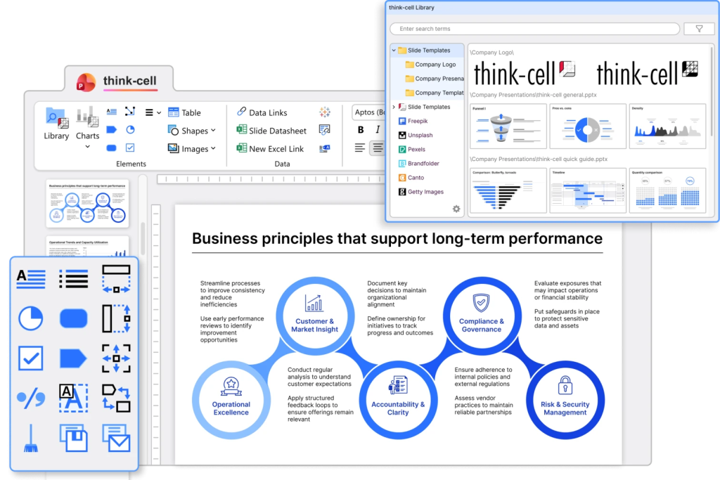 think-cell Suite adalah paket lengkap yang mencakup think-cell Core, Library, dan Charts untuk mendukung seluruh proses pembuatan presentasi, termasuk visualisasi data dan otomatisasi lebih optimal. Fitur Utama think-cell Suite :